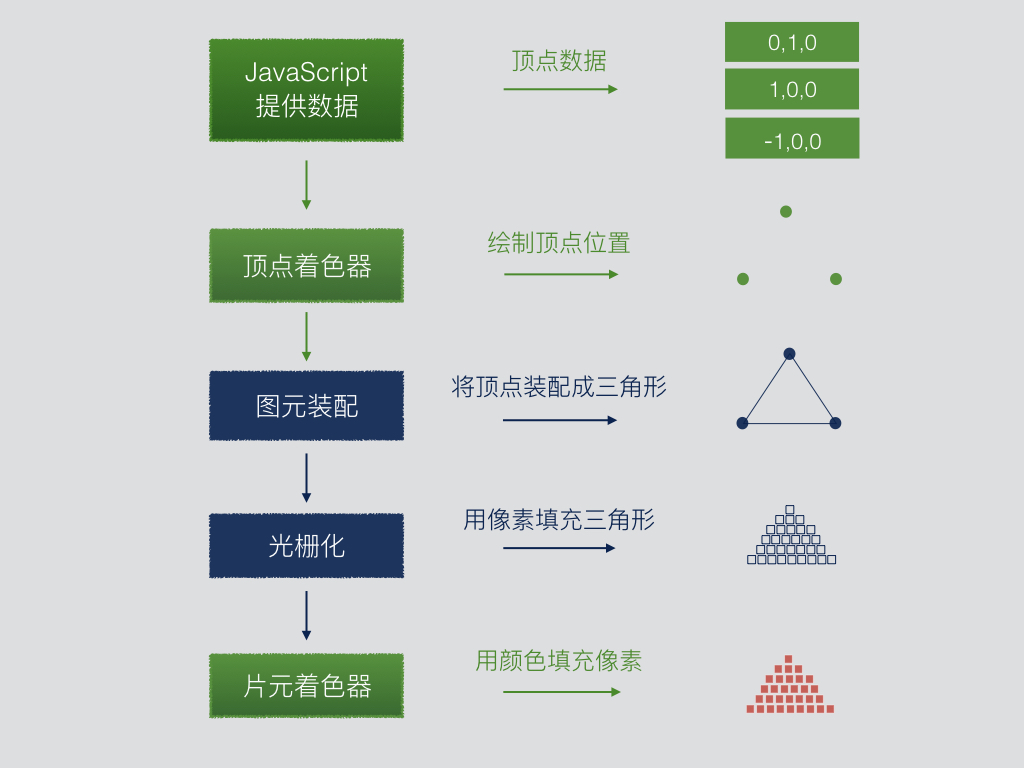 上图简单演示了 WebGL 对一个红色三角形的渲染过程,绿色部分为开发者可以通过编程控制的部分: