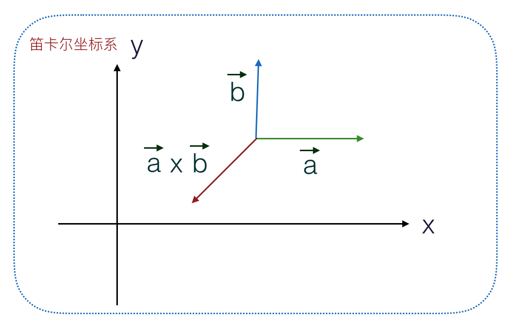 如上图,利用右手定则,当右手的四指从向量 a 以不超过 180 度的转角转向 b 时,竖起的大拇指指向是叉乘结果向量的方向。