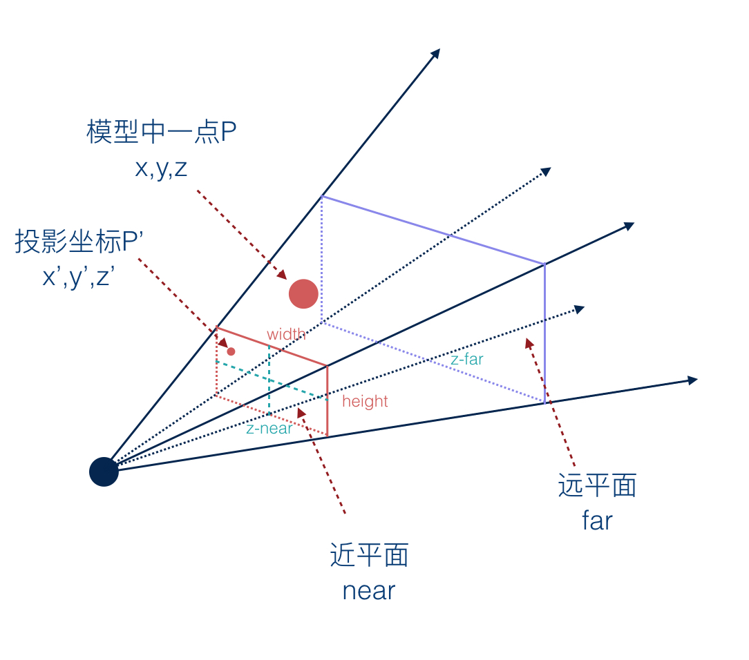接下来分析一下如何根据这些已知条件推导出 P'坐标,当推导出 P' 坐标之后,也就有了相应地投影矩阵。