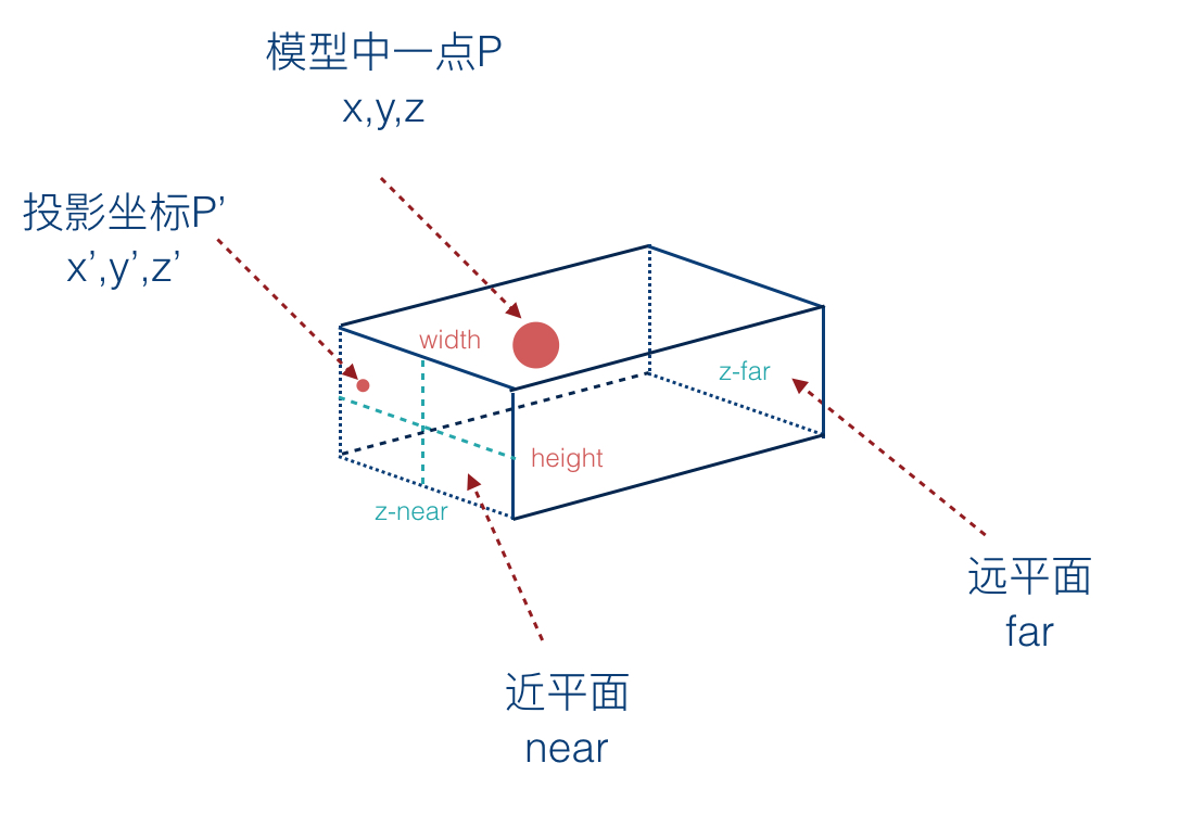 通过上面的示意图,我们能看到,正交投影盒中的一点 P(x, y, z),其中: