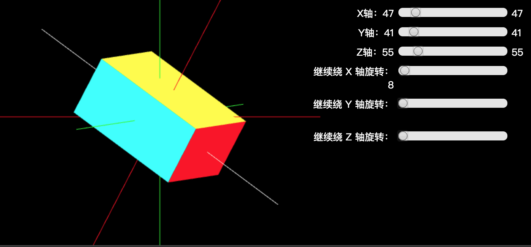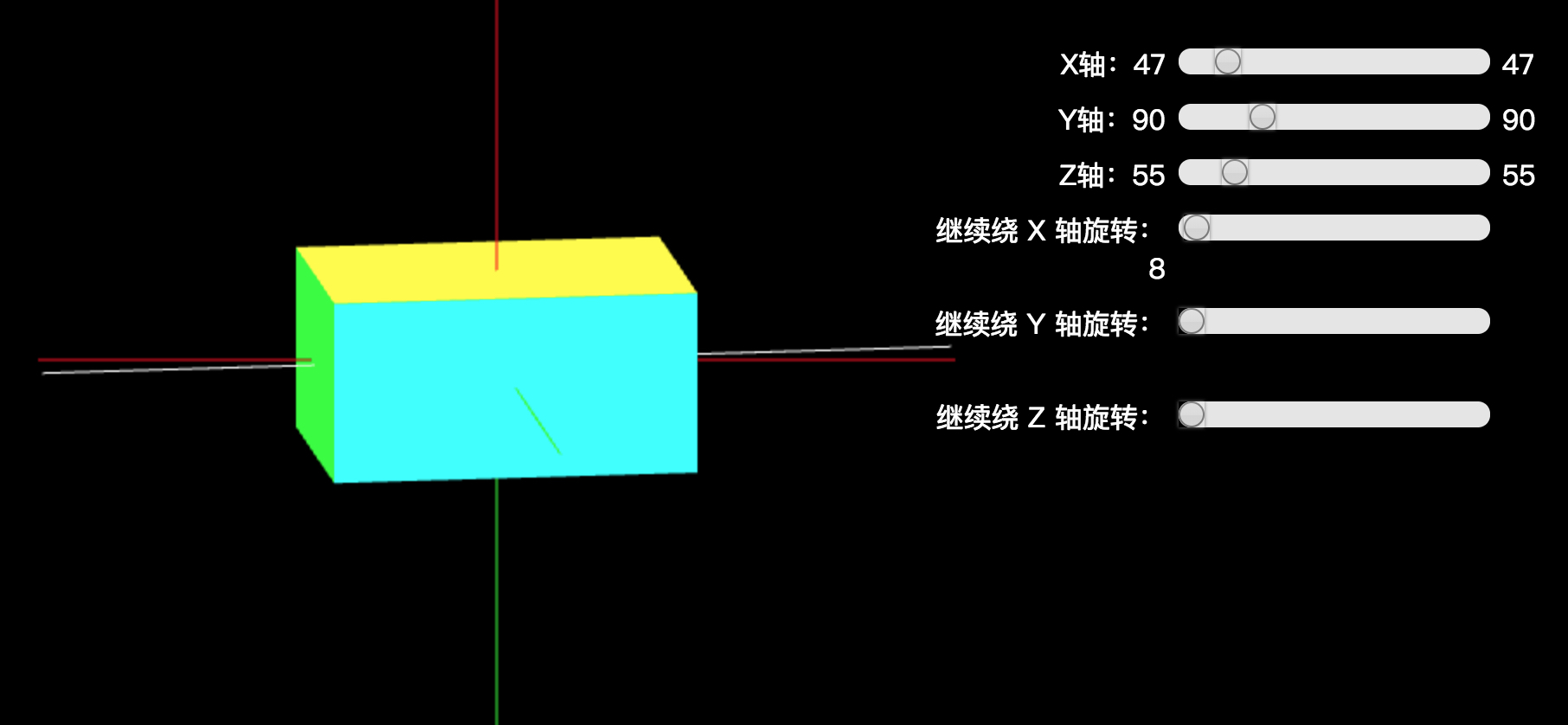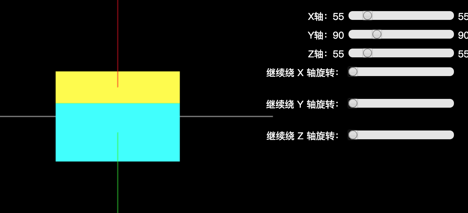 var currentMatrix = matrix.makeRotationFromQuaternion(unitQuaternion);有了初始角度到每一帧角度的旋转矩阵 U ,那么左乘该旋转矩阵 U 可以实现平滑均匀的旋转动画了,如下: