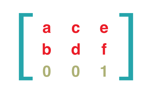 事实上,二维变换矩阵是一个 3 阶矩阵,包含 3 x 3 = 9 个数字,但是你会发现 matrix 是由 6 个数字组成,它们对应一个 3 阶矩阵的如下部分: