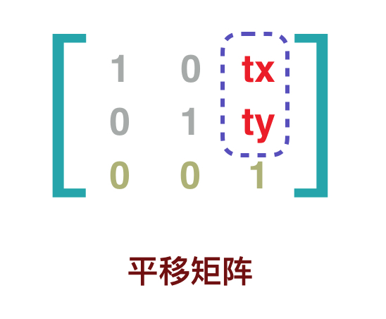 如果 matrix 只表示平移时,只需要改变 tx 和 ty 即可,其中 tx 代表沿着 X 轴平移的像素值,ty 代表沿着 Y 轴平移的像素值。其余元素都是固定值,仅仅改变 tx 和 ty即可。