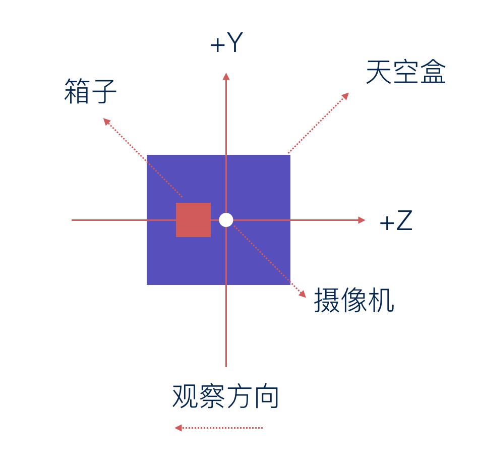 在上面的例子里,我们增加一个箱子,该箱子是长宽高均为 20 的立方体,上面的天空盒是长宽高为 500 的立方体,很明显,箱子在天空盒内部。