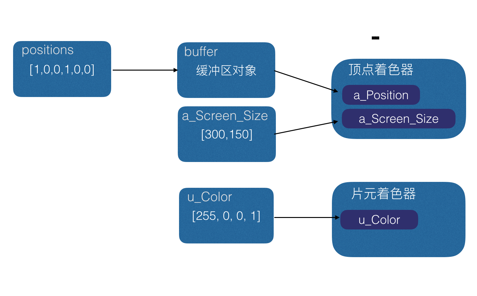 gl.bufferData(gl.ARRAY_BUFFER, new Float32Array(positions), gl.STATIC_DRAW);注意,着色器程序中的变量需要强类型数据,所以我们在往缓冲区写数据的时候,JS 的弱类型数组一定要用类型化数组转化一下。上面的